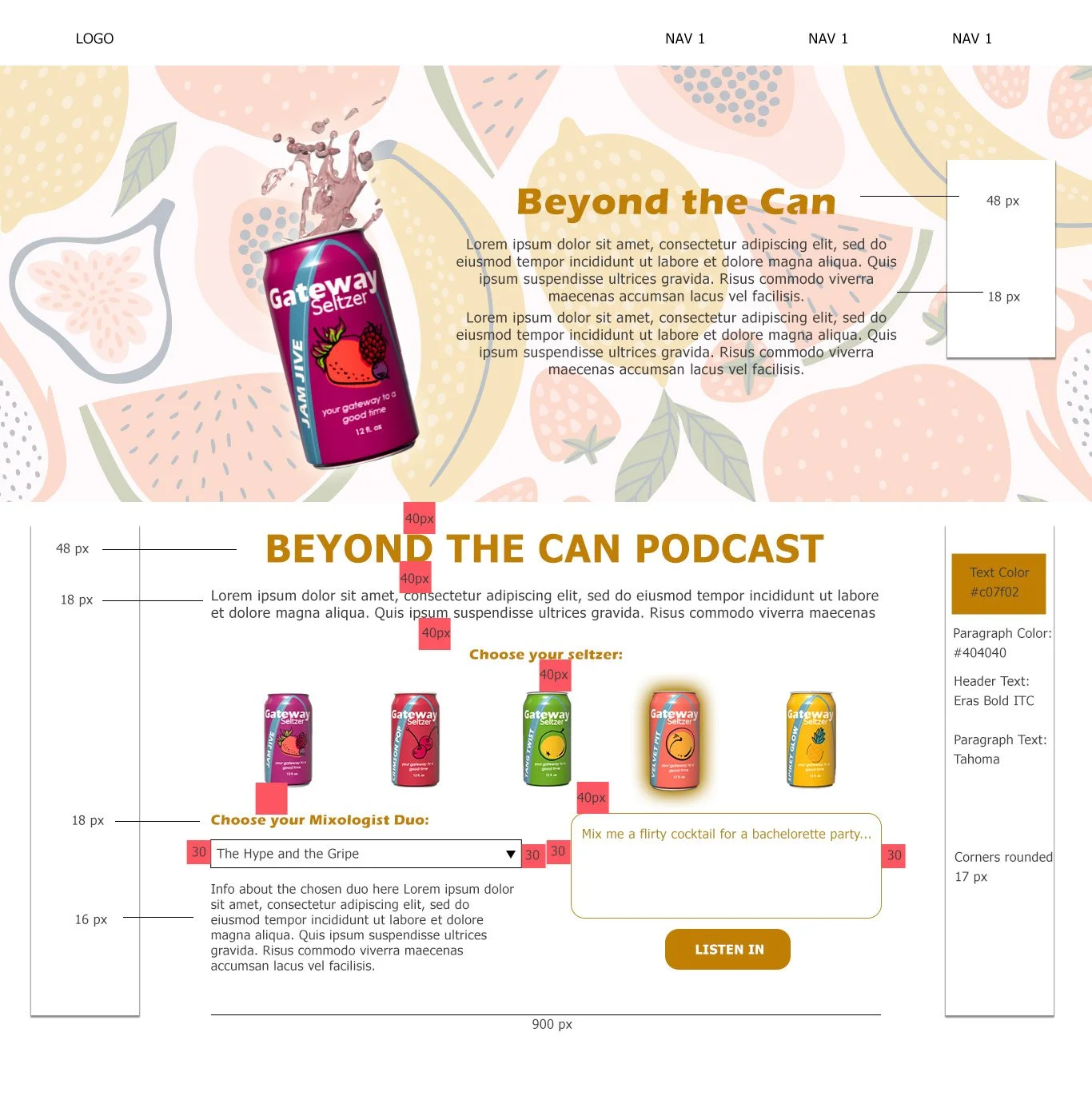 We liked the splash coming out of the can but, since the can was at an angle and changed depending on which flavor the user clicked, it ended up being unpredictable so we took out that imagery. The two column design felt a little out of place as well, so we opted for a cleaner single column design.